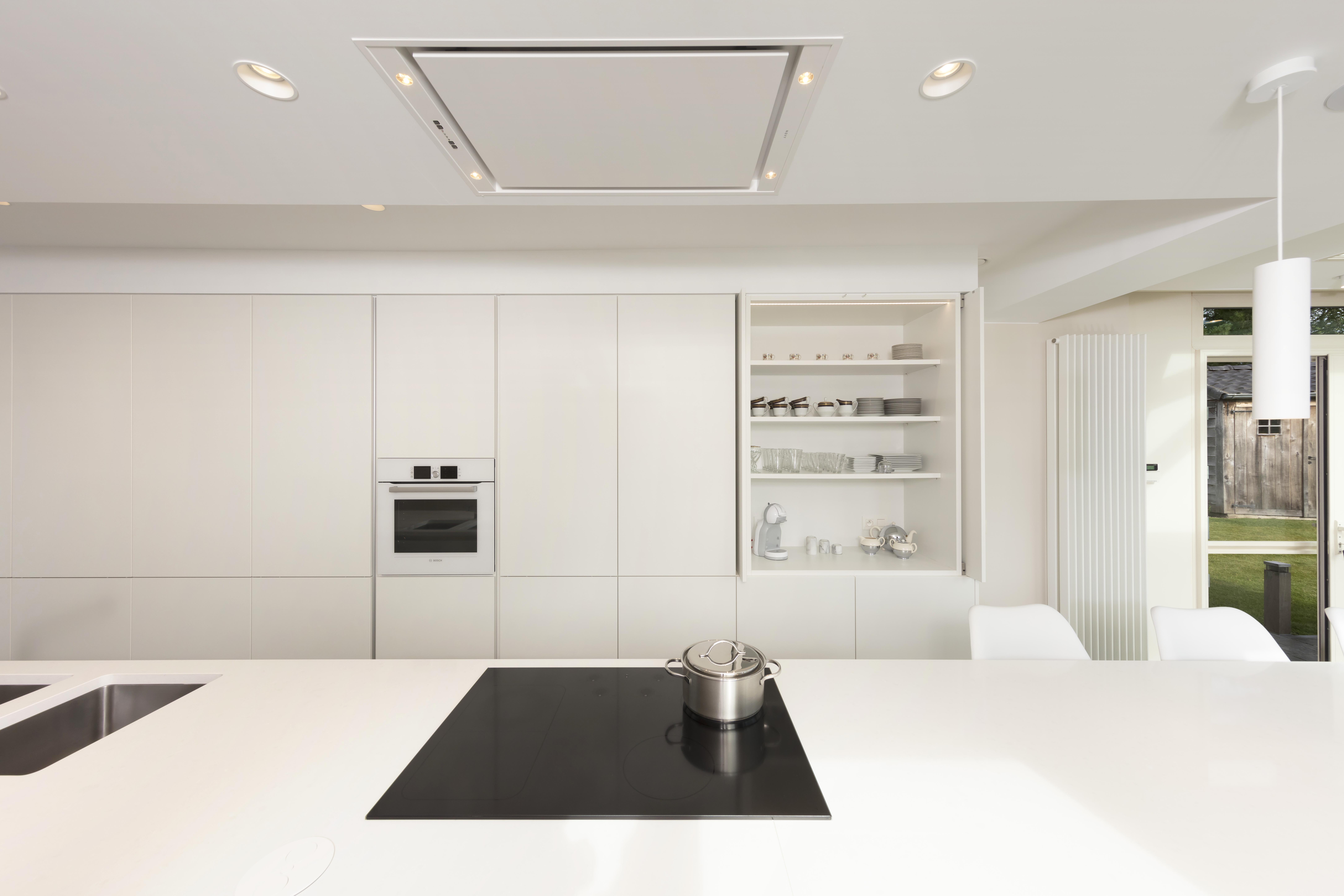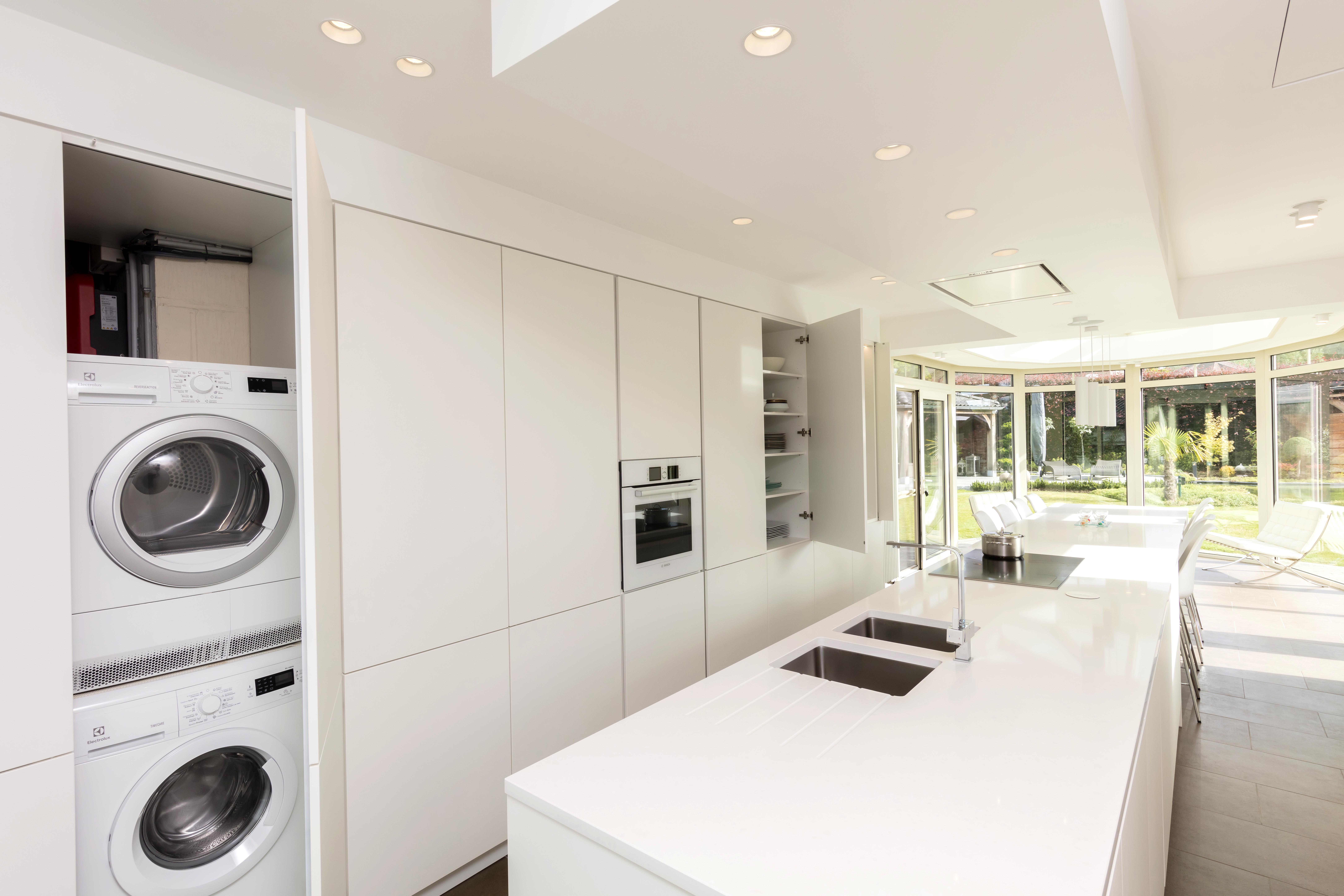 Deze volledig witte moderne keuken heeft veel te verbergen door de op maat gemaakte inbouwkasten. Koffie is voor de meeste ochtendrituelen onmisbaar, ook bij deze klant. Daarom hebben wij op vraag van de klant een koffiecorner ingericht. De was- en droogmachine werden verdoken in inbouwkasten om zo te kunnen genieten van een optimale bergruimte. Het keukeneiland is voorzien om 6 krukken te plaatsen over de volledige lengte van het werkblad.
