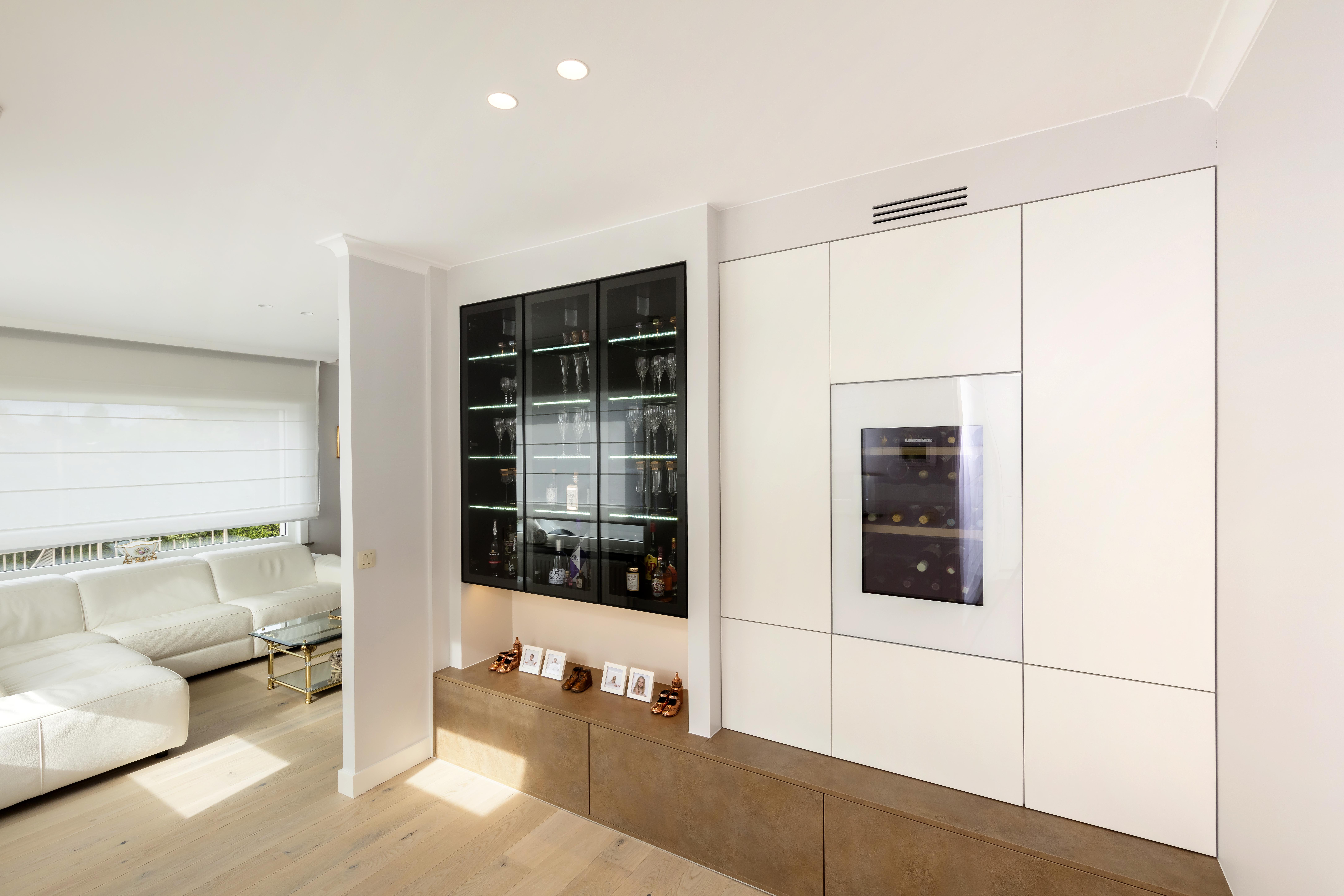 Dezelfde witte materialen die werden gebruikt in de keuken werden doorgetrokken in de woonkamer. In de woonkamer werd dan weer een wijnkast op maat voorzien, als eyecatcher van de woning. Deze trekt direct de aandacht door de zwarte glazen kast met LED verlichting. Greeploze laden in brons beton optik maken de overgang van de parketvloer naar het meubel optimaal.