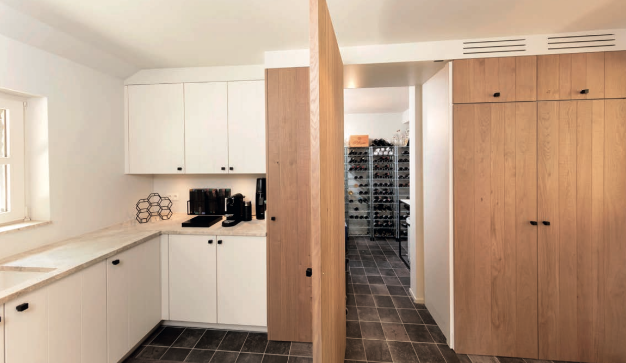 Mooi detail: in het verlengde van de kolomkasten is de deur naar de wijnkamer bijna onzichtbaar verwerkt in hetzelfde fineerhout als de kastenwand.