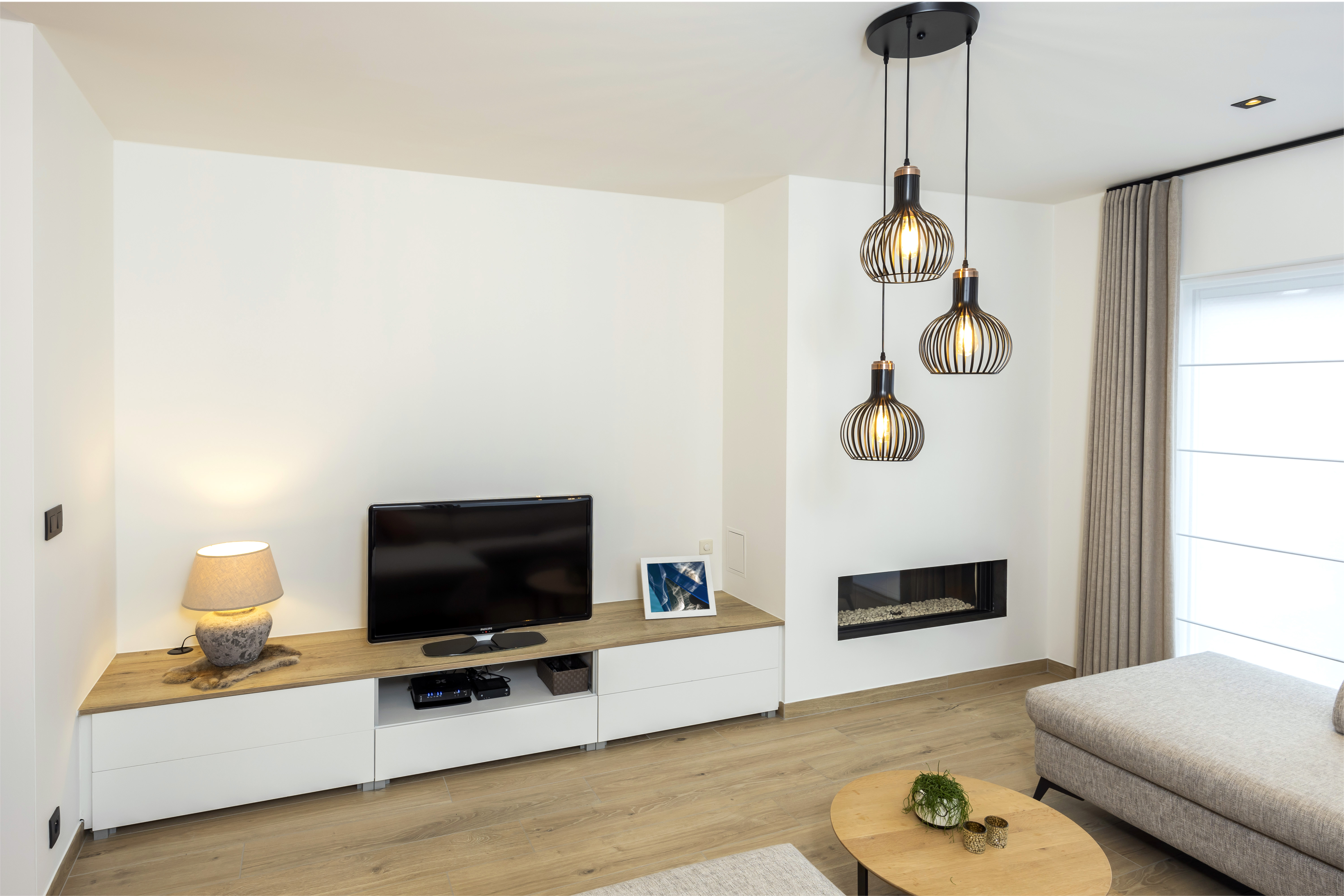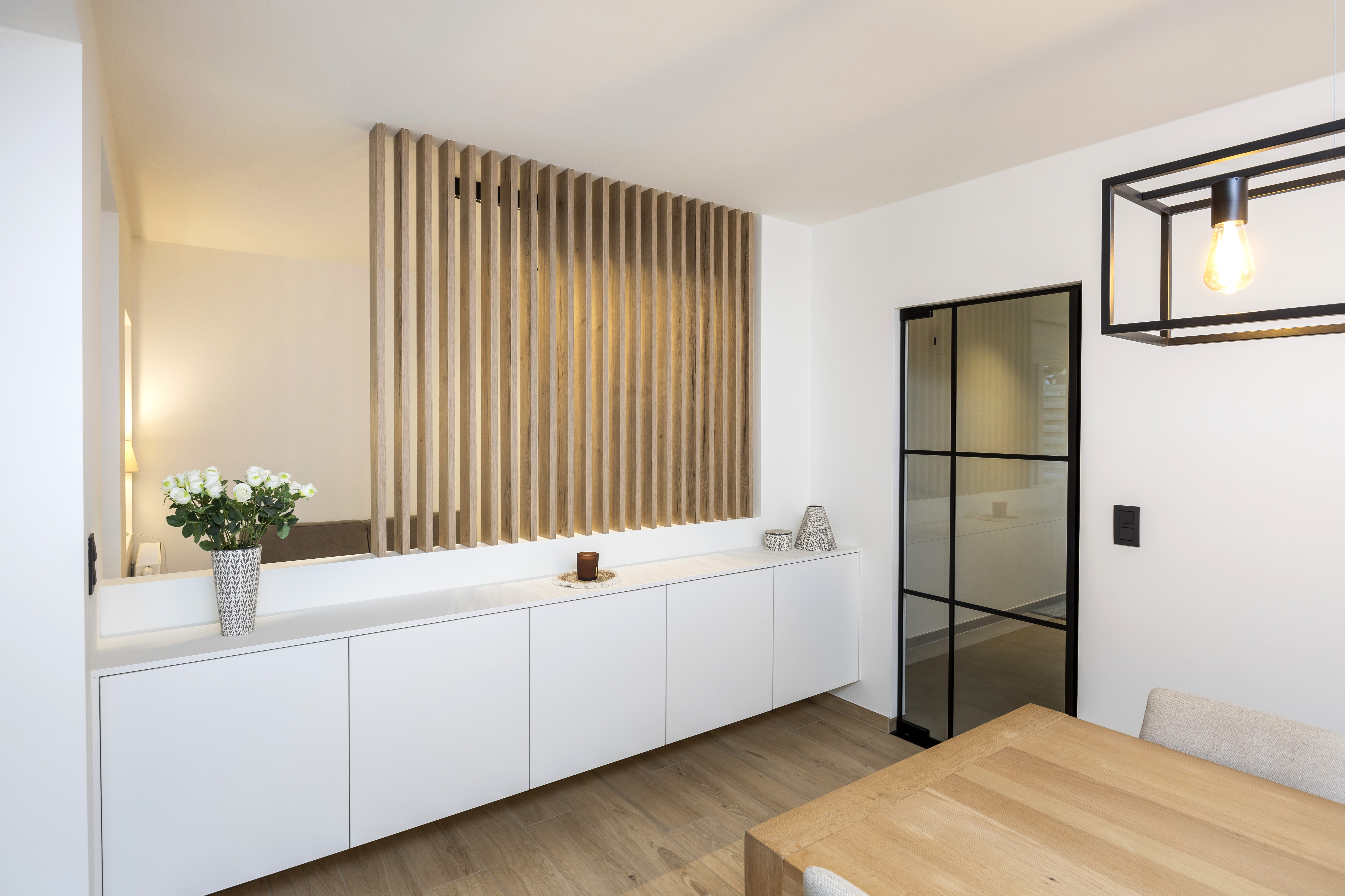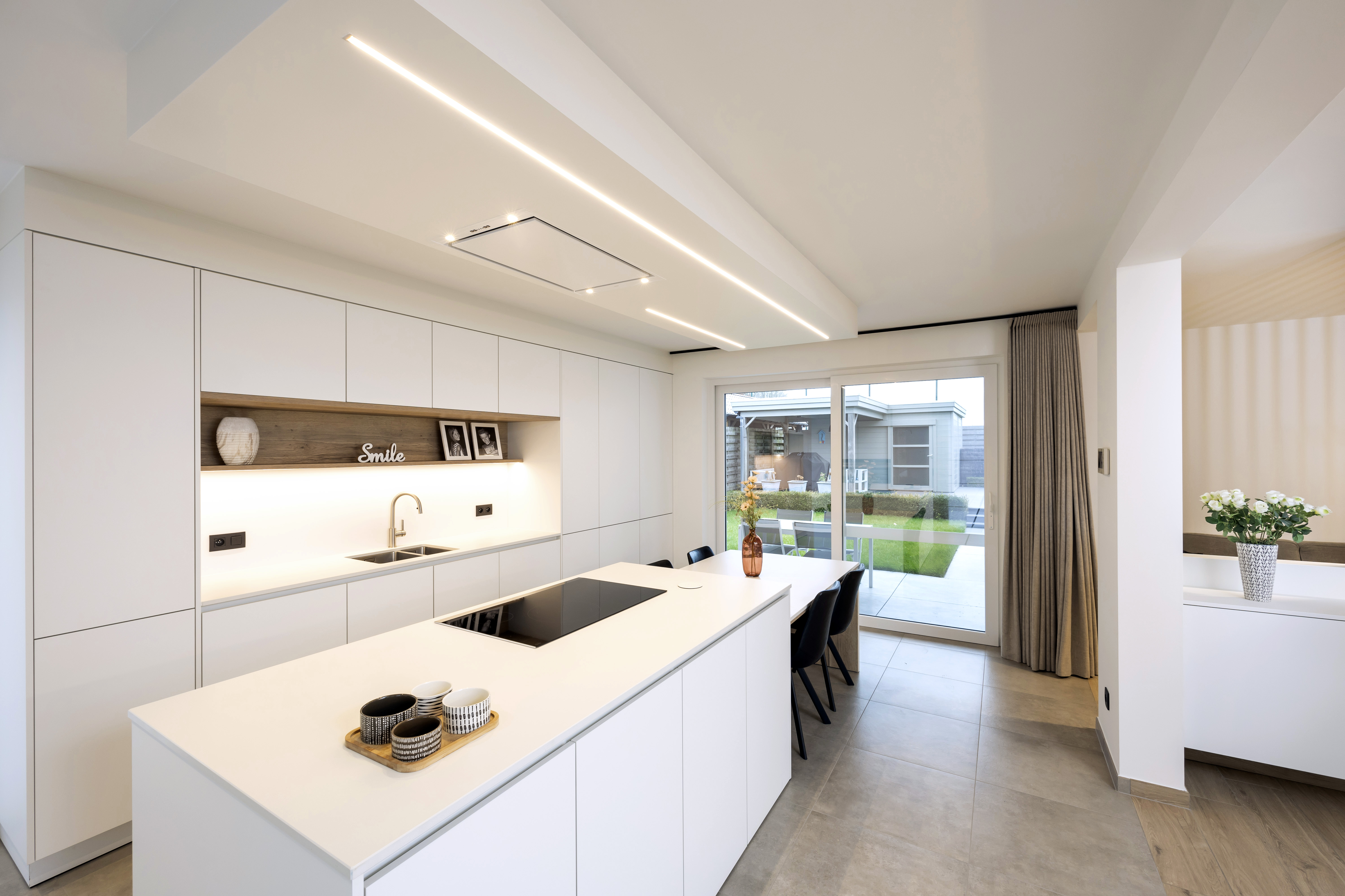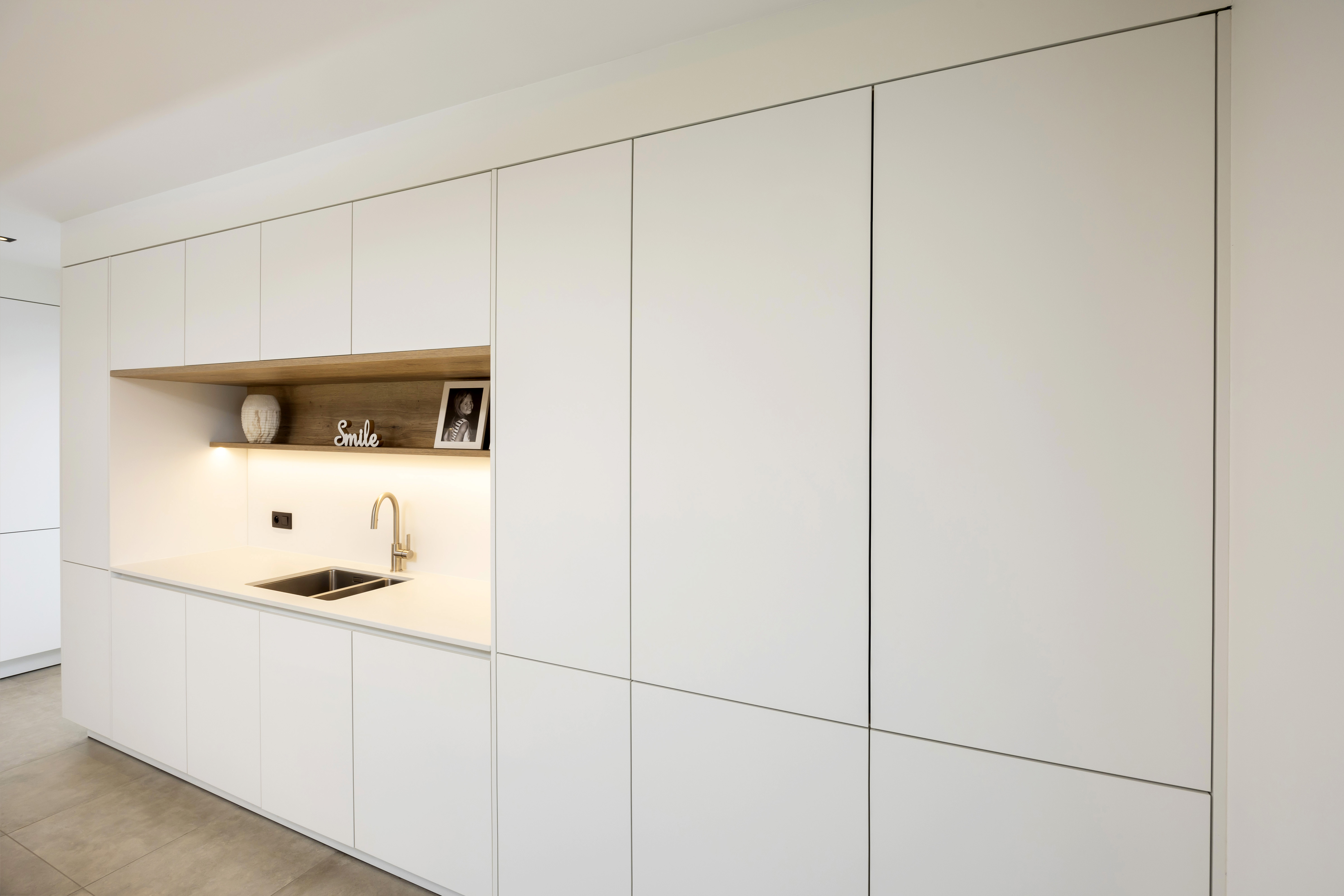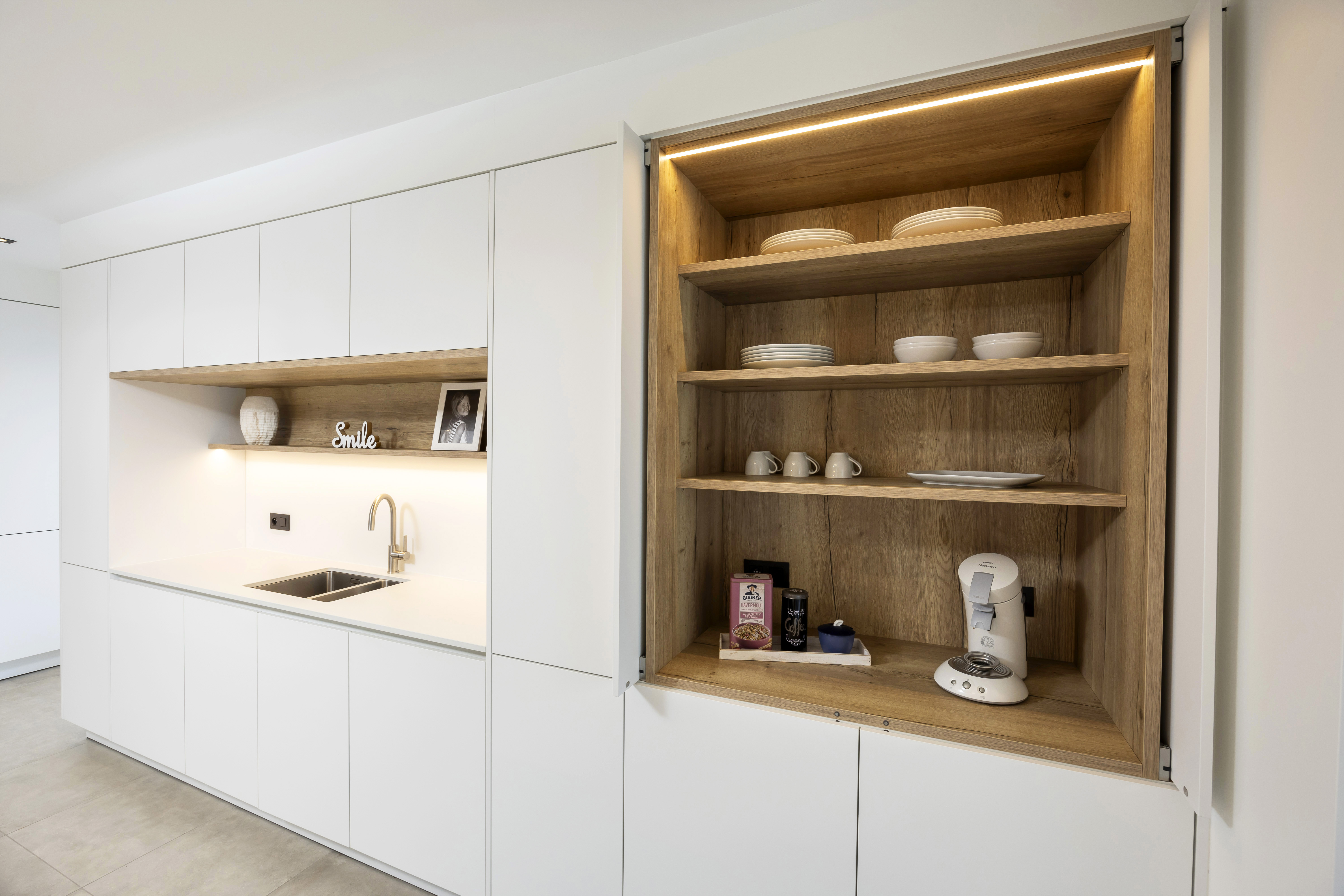 Helder Fenix wit, een composiet werkblad en de combinatie met een warme houtkleur zorgt er voor dat de keuken naadloos overvloeit naar de living.