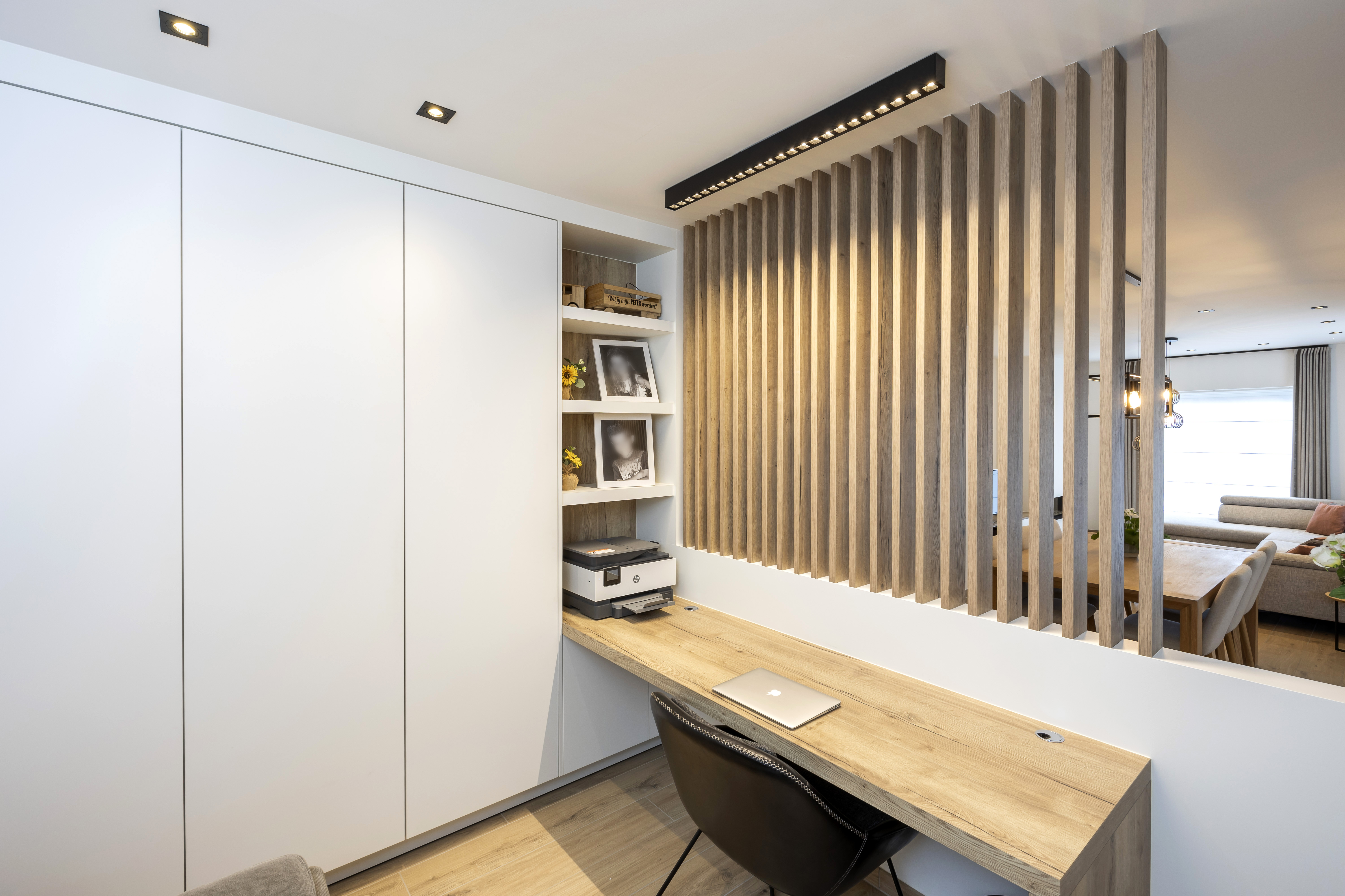Achter het verticale lattenwerk verscholen, blijft de bureau verbonden met het gezinsleven.