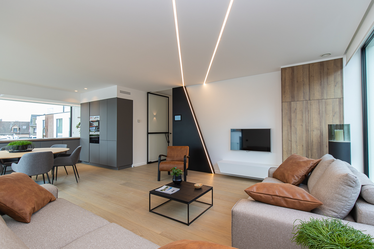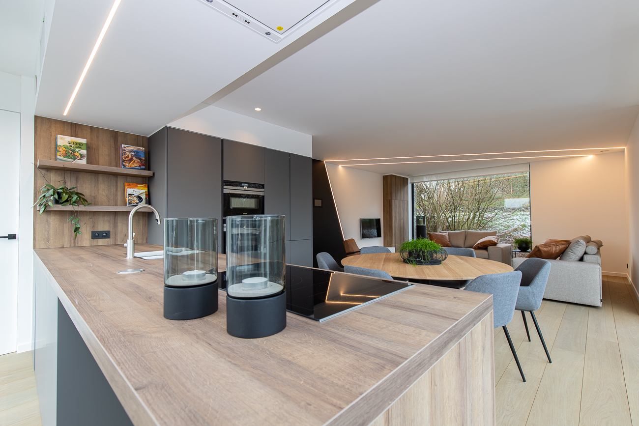 De Onyx grijs gelakte deuren van de keuken vormen één geheel met de rest van de inrichting in dit appartement. De herhaling van de kleur van het werkblad in de maatkast van de living, versterkt op zijn beurt deze eenheid, terwijl het toogje aan het raam uitnodigt tot een gezellig ontbijt of een aperitief met vrienden.