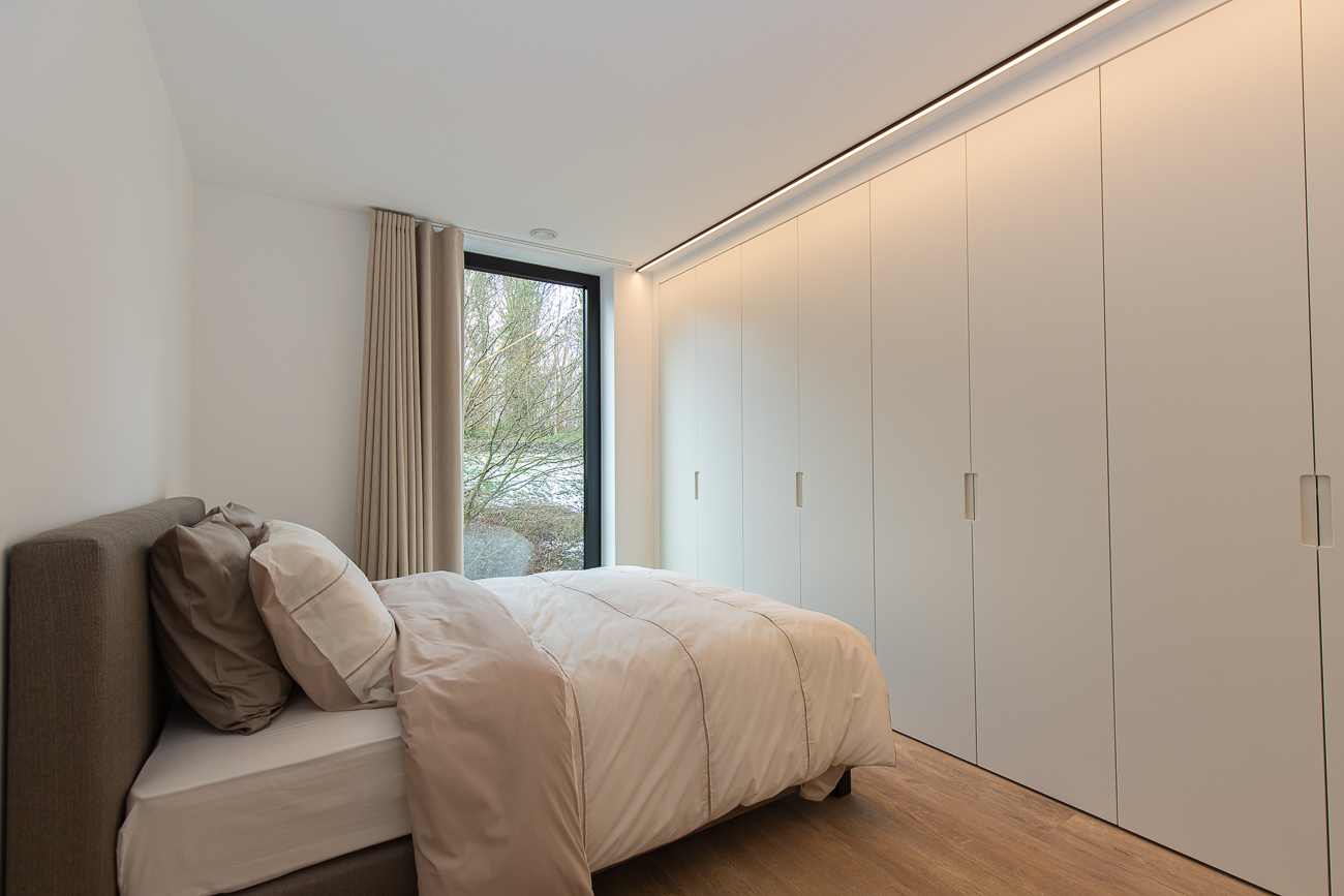 De gelakte deuren met uitgefreesde grepen van de kamerhoge kast in de slaapkamer zijn in dezelfde kleur als deze van de muren. Dit zorgt voor een tijdloos design en geeft een persoonlijke toets aan 'the masterbedroom".