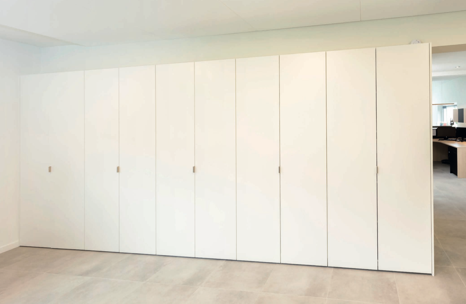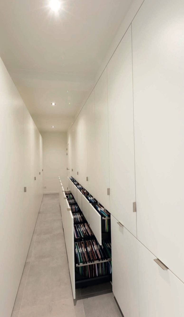 Een verlichtingsarmatuur op maat zorgt voor een luchtig en speels karakter op de werkvloer. De hoge kasten bieden een maximale bergruimte voor de talrijke klasseermappen.