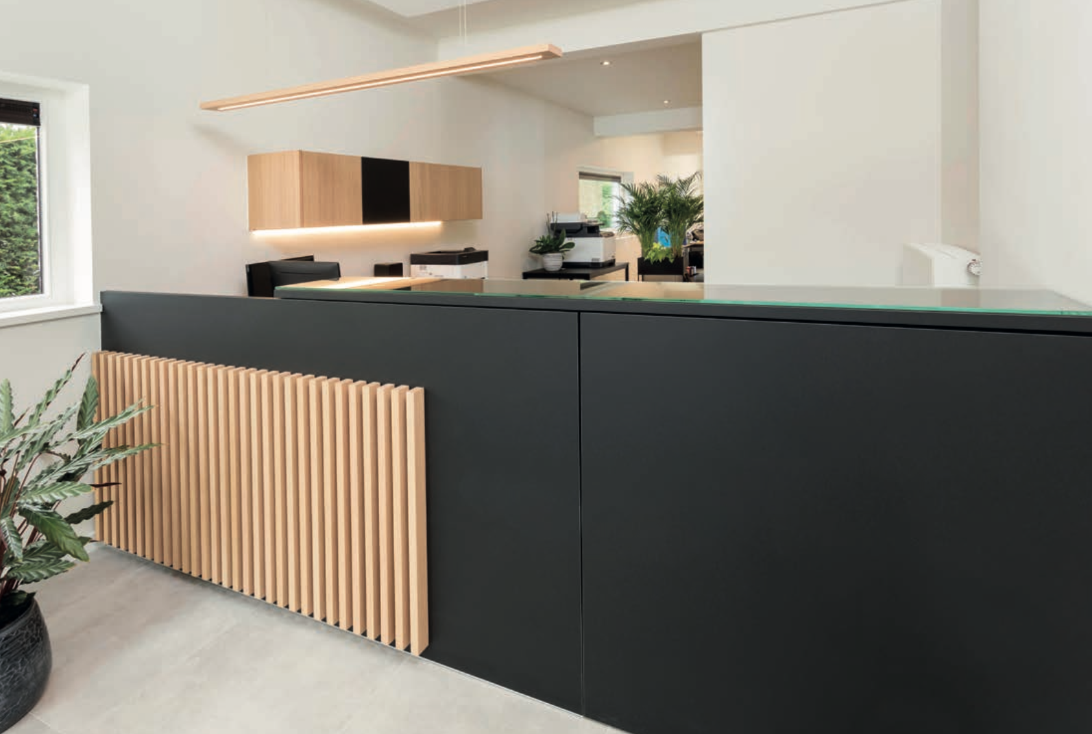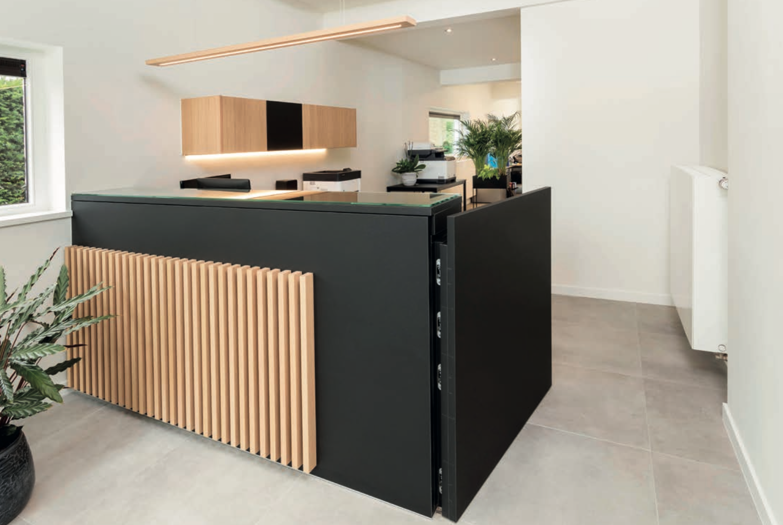 Het onthaal van dit boekhoudkantoor is een echte eyecatcher. Maatwerk ten top! De verticale latten in natuur eik op de zwarte ondergrond geven een uitnodigende aanblik. Via een onzichtbare deur krijgt de klant toegang tot het kantoor terwijl een glazen tablet die wegschuift van de doorgangsdeur, het toelaat om klanten enkel aan de balie te ontvangen.