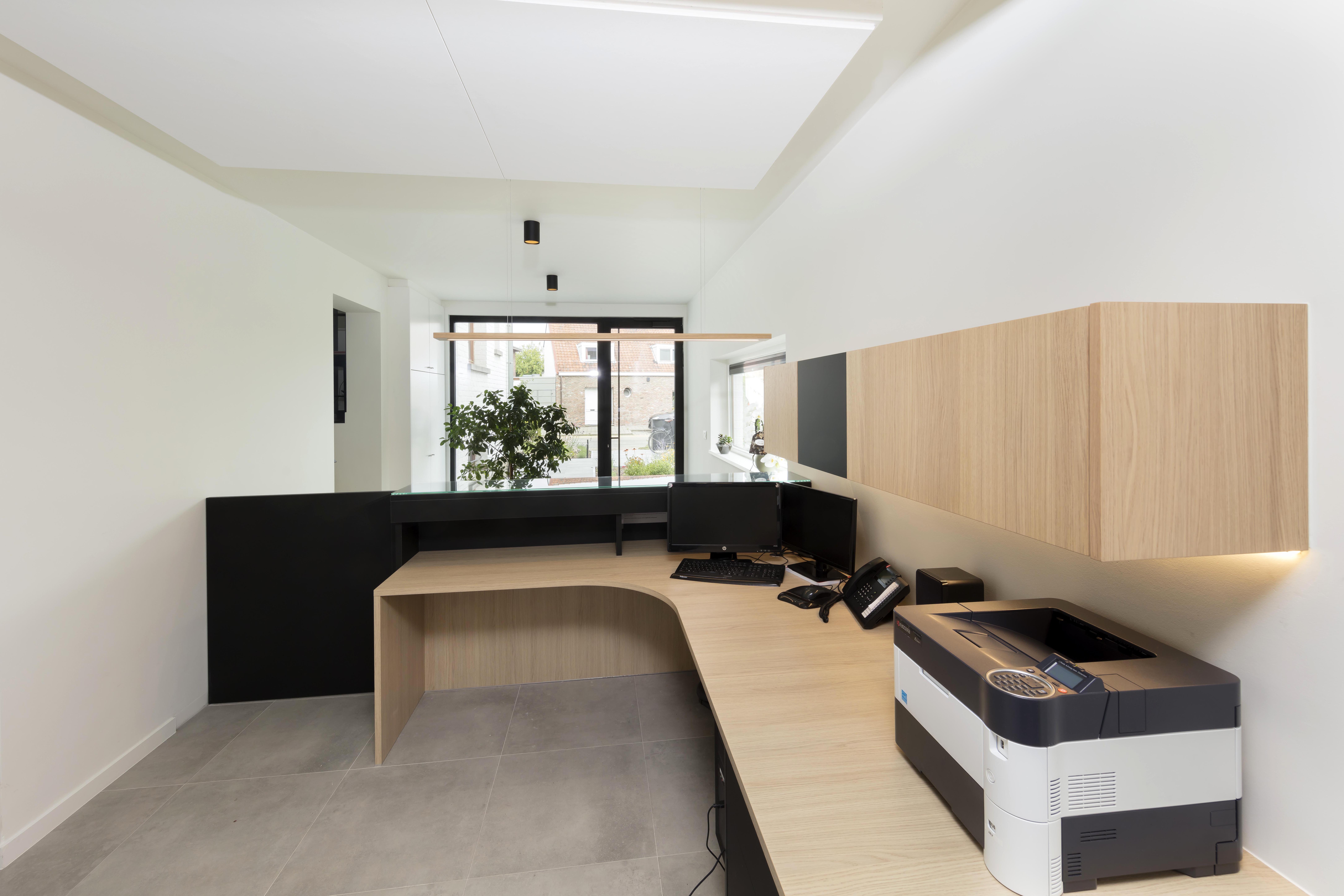 Het achterliggende bureel in laminaat vormt een harmonieus geheel met de kasten in natuurhout.